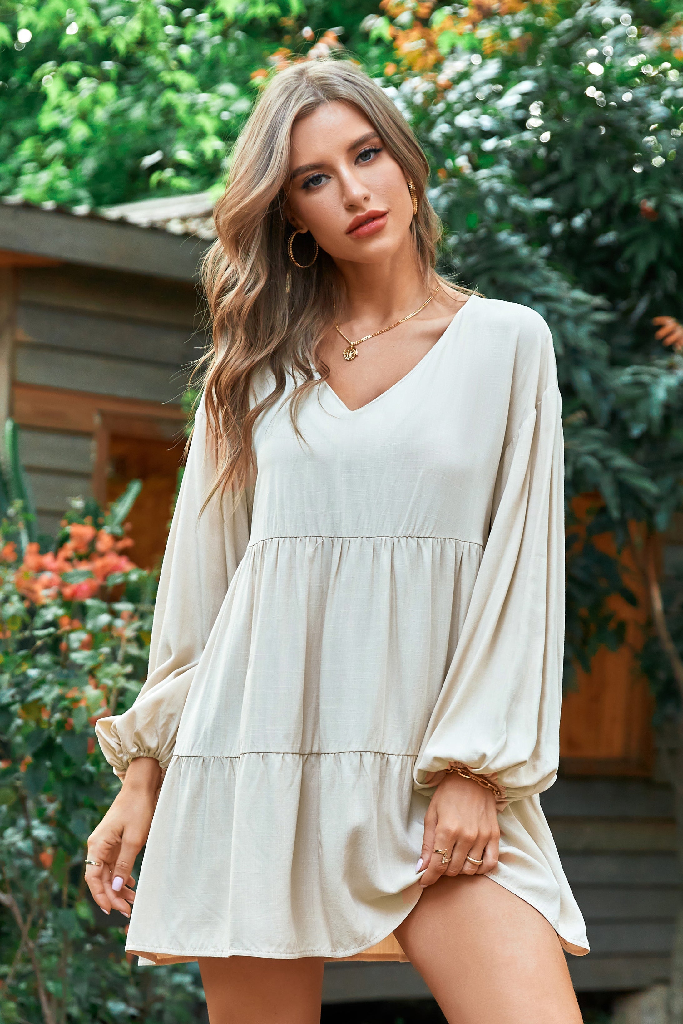 Vestido Cofete de color albaricoque con escote V y en forma de A