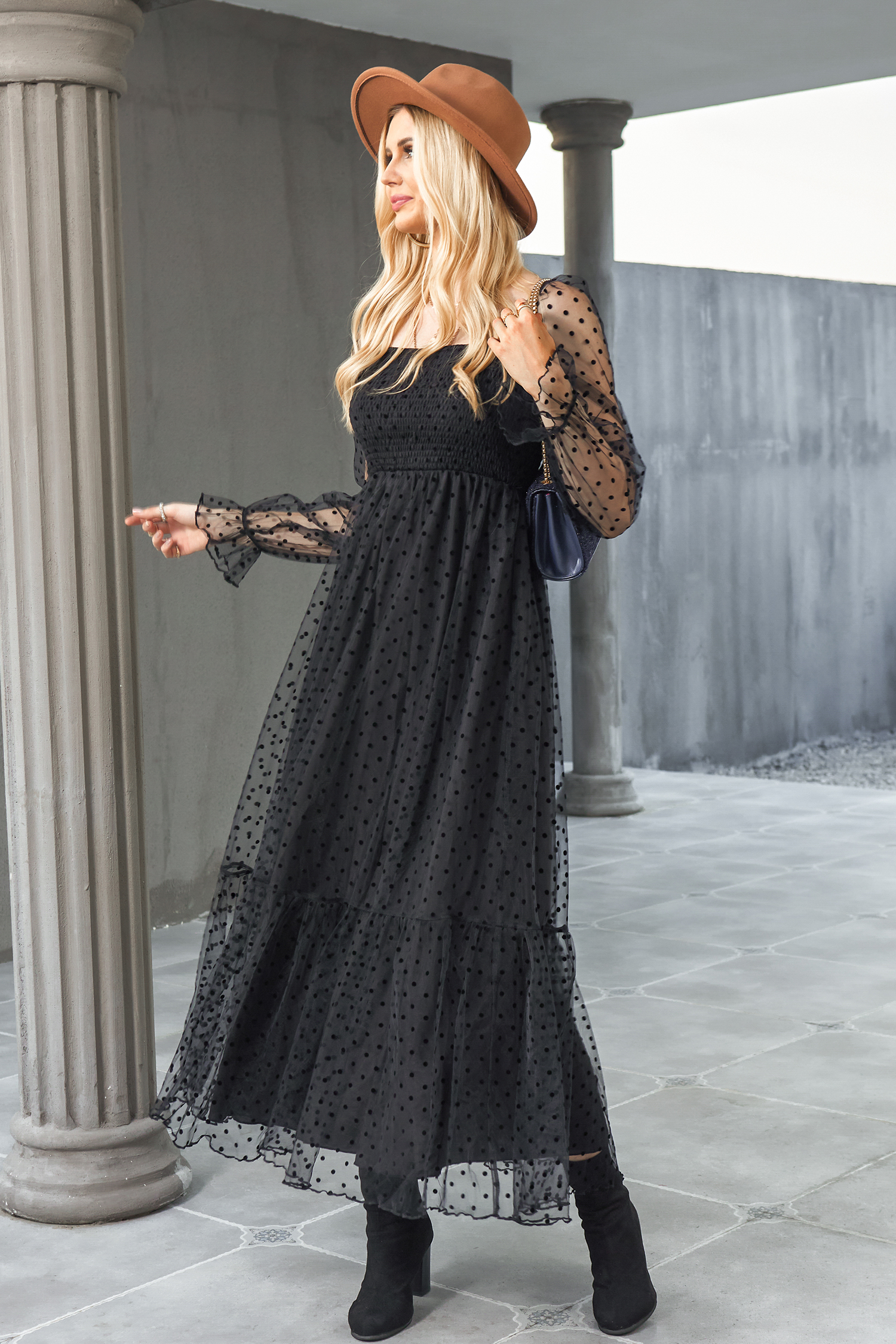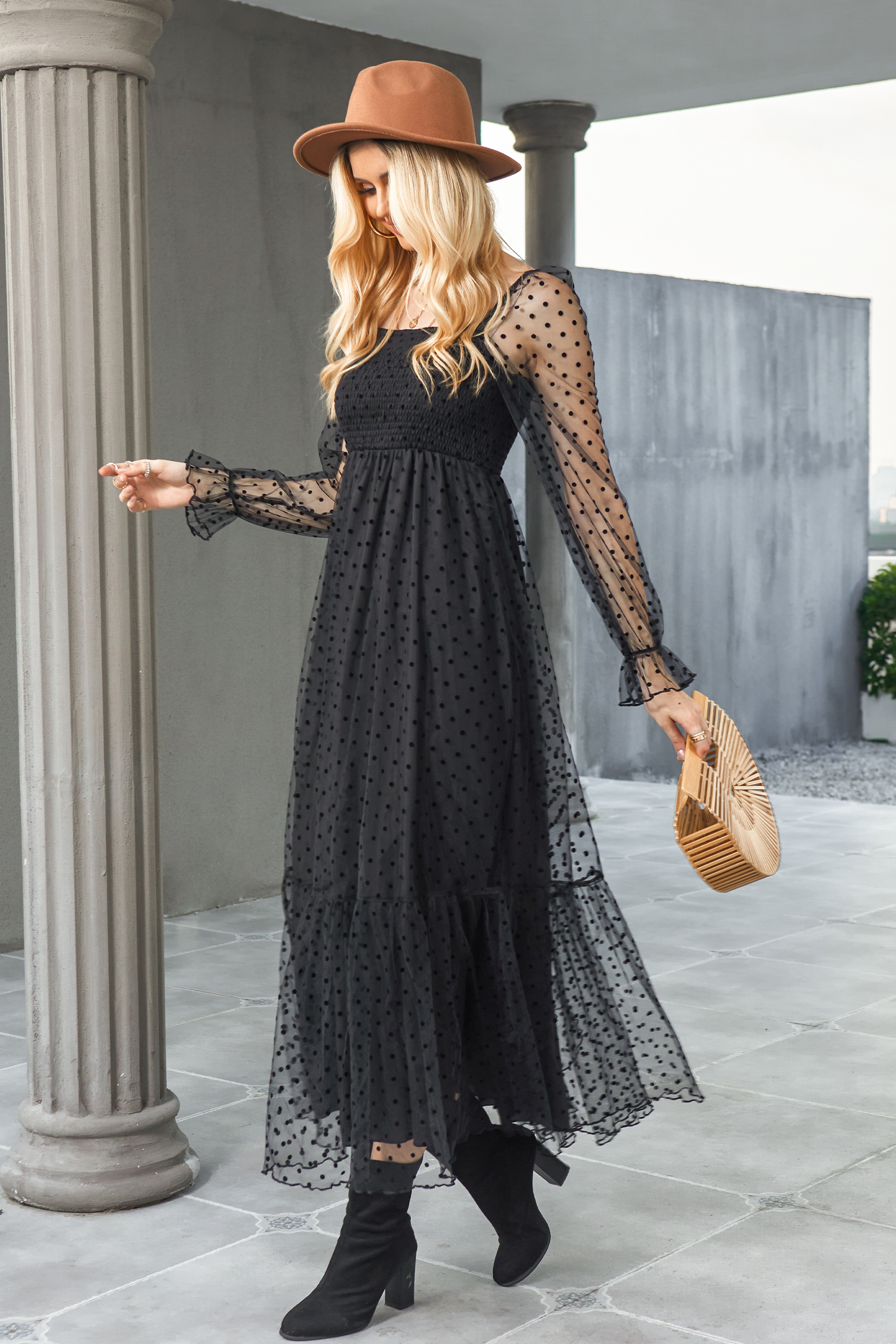 Vestido largo fruncido con lunares