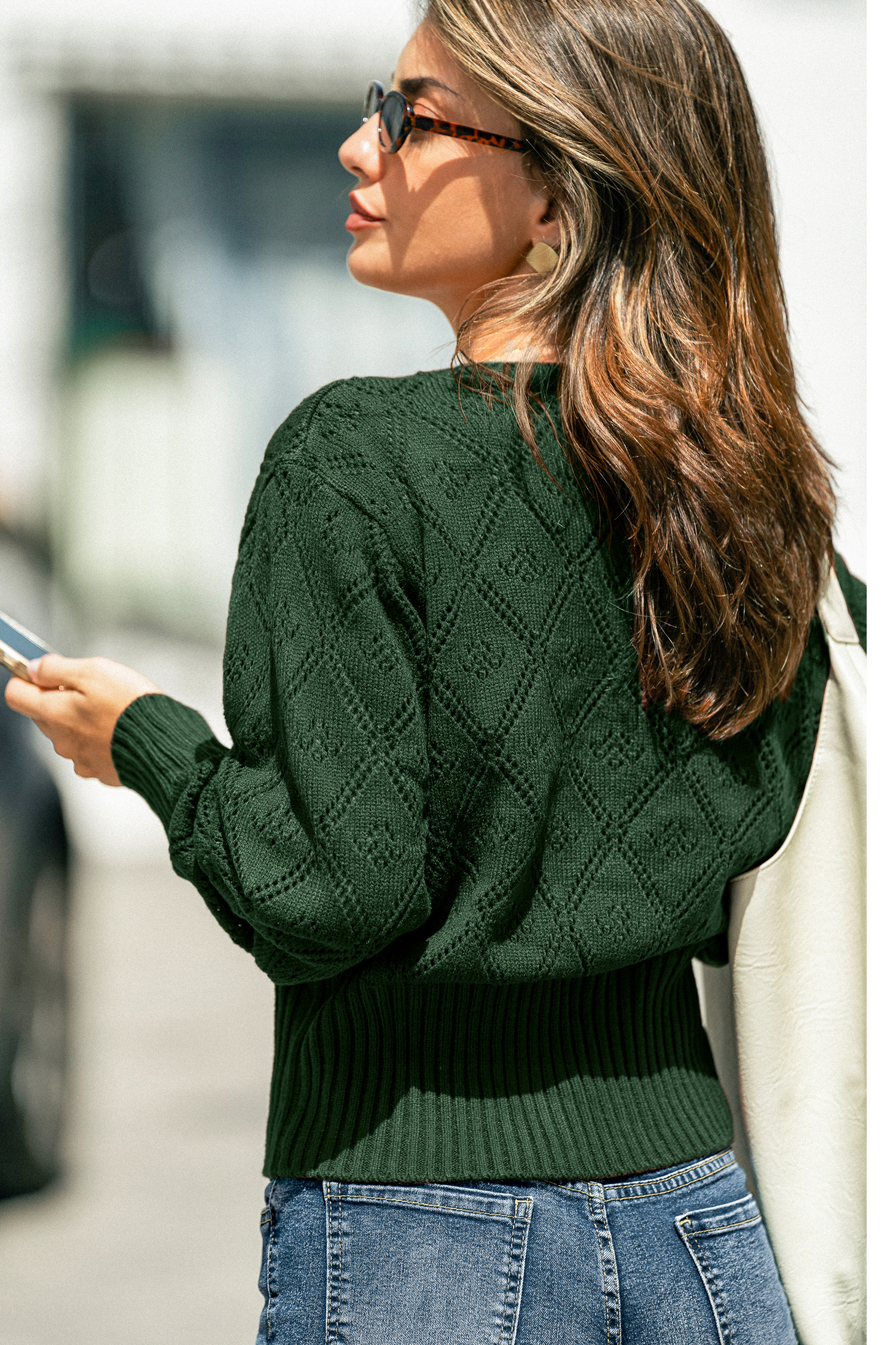El cálido suéter marrón cacao es acogedor y coqueto. Su cuello redondo y mangas largas lo convierten en una opción sencilla pero elegante para los días más fríos.
