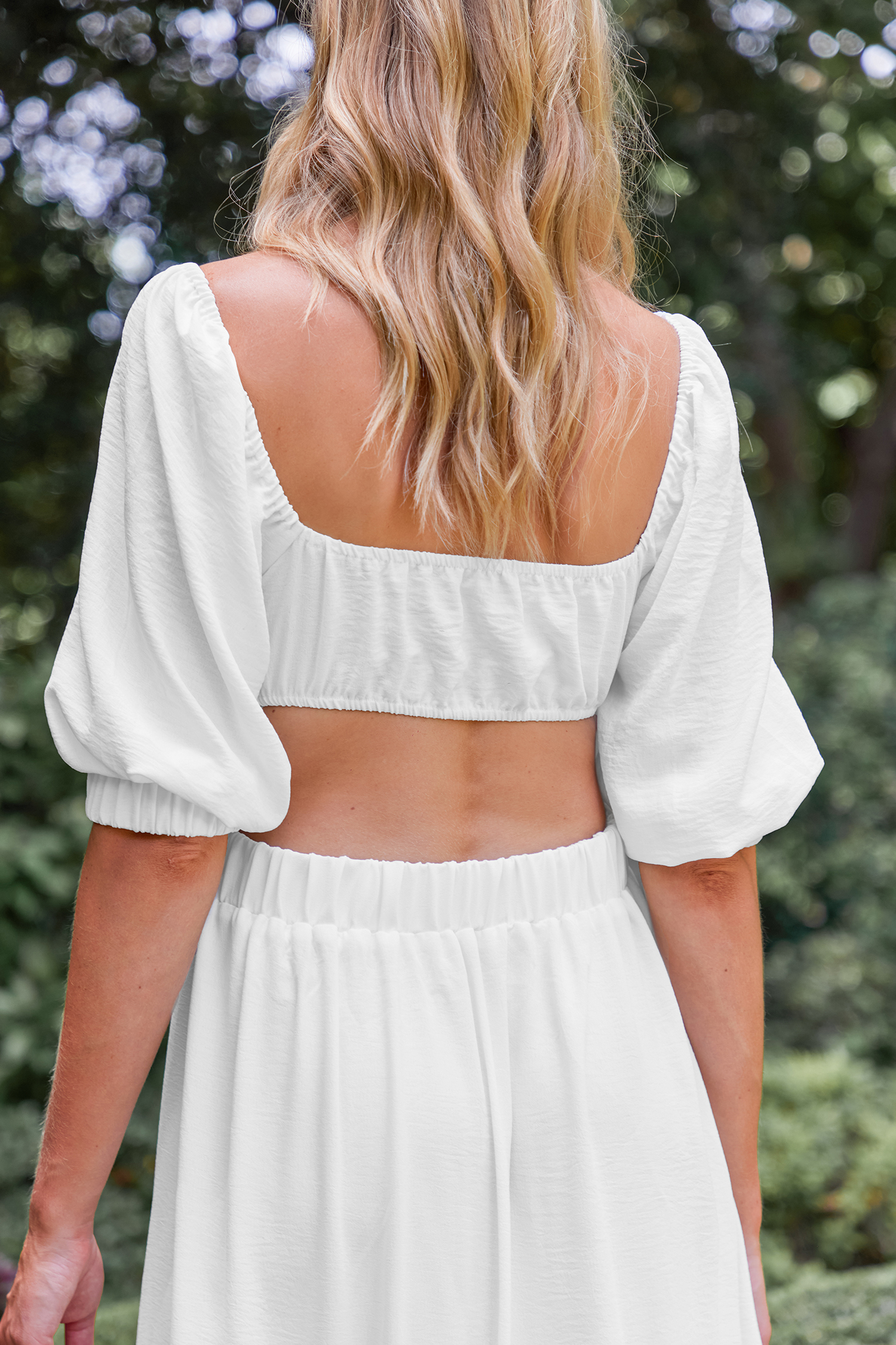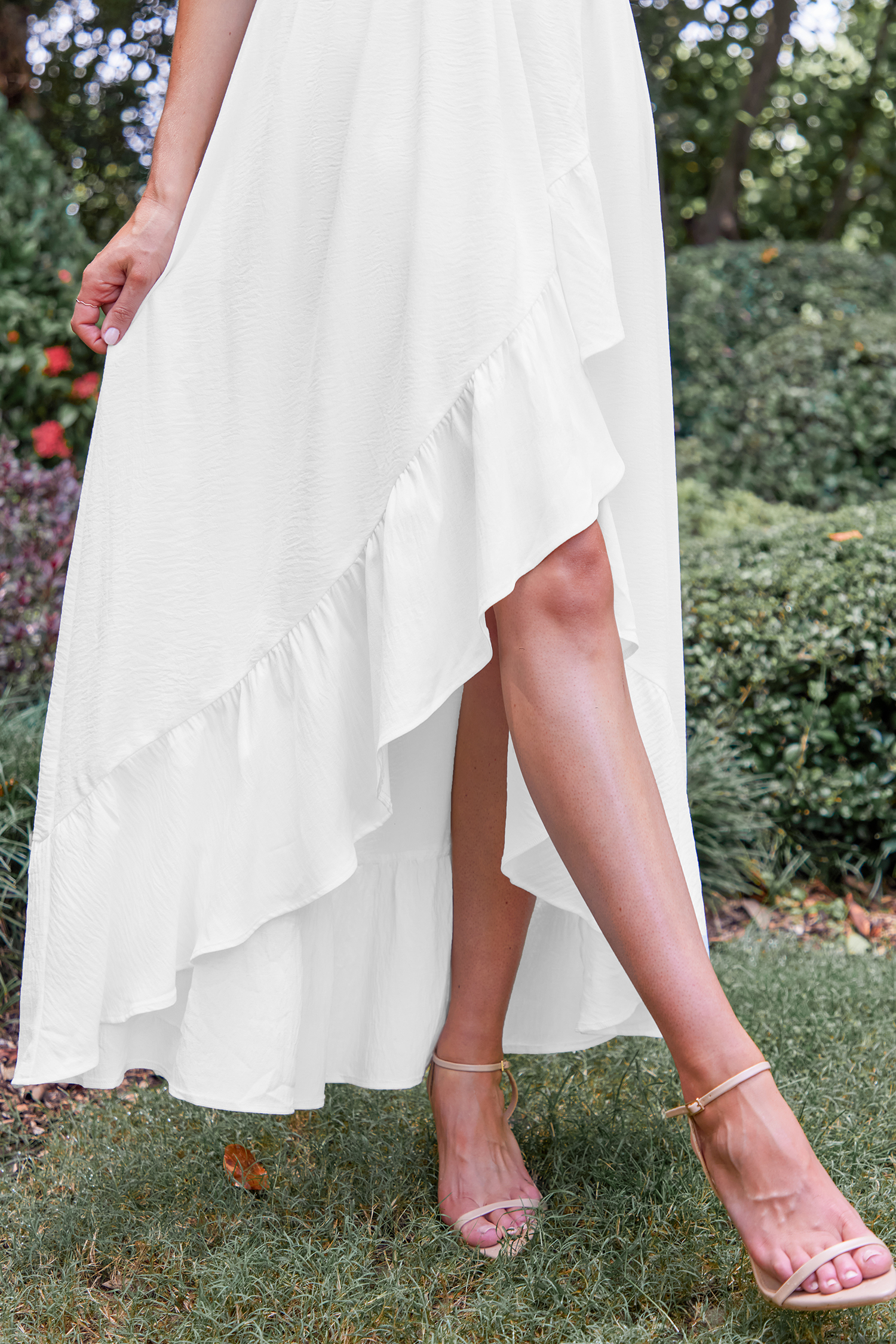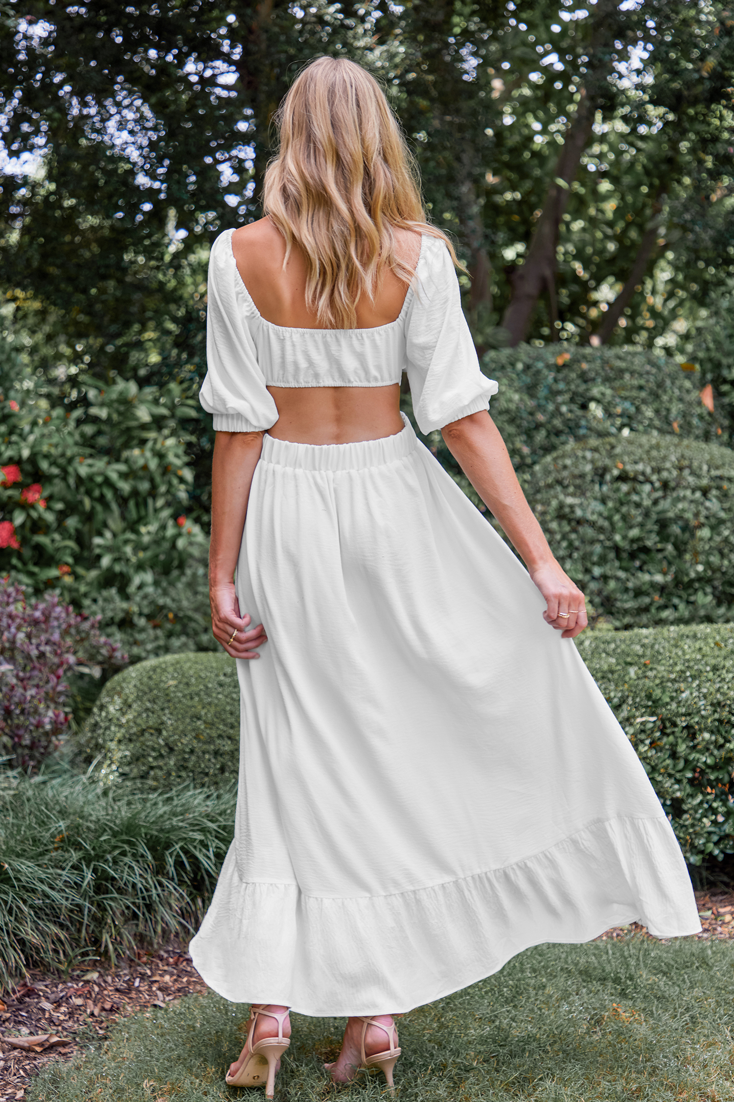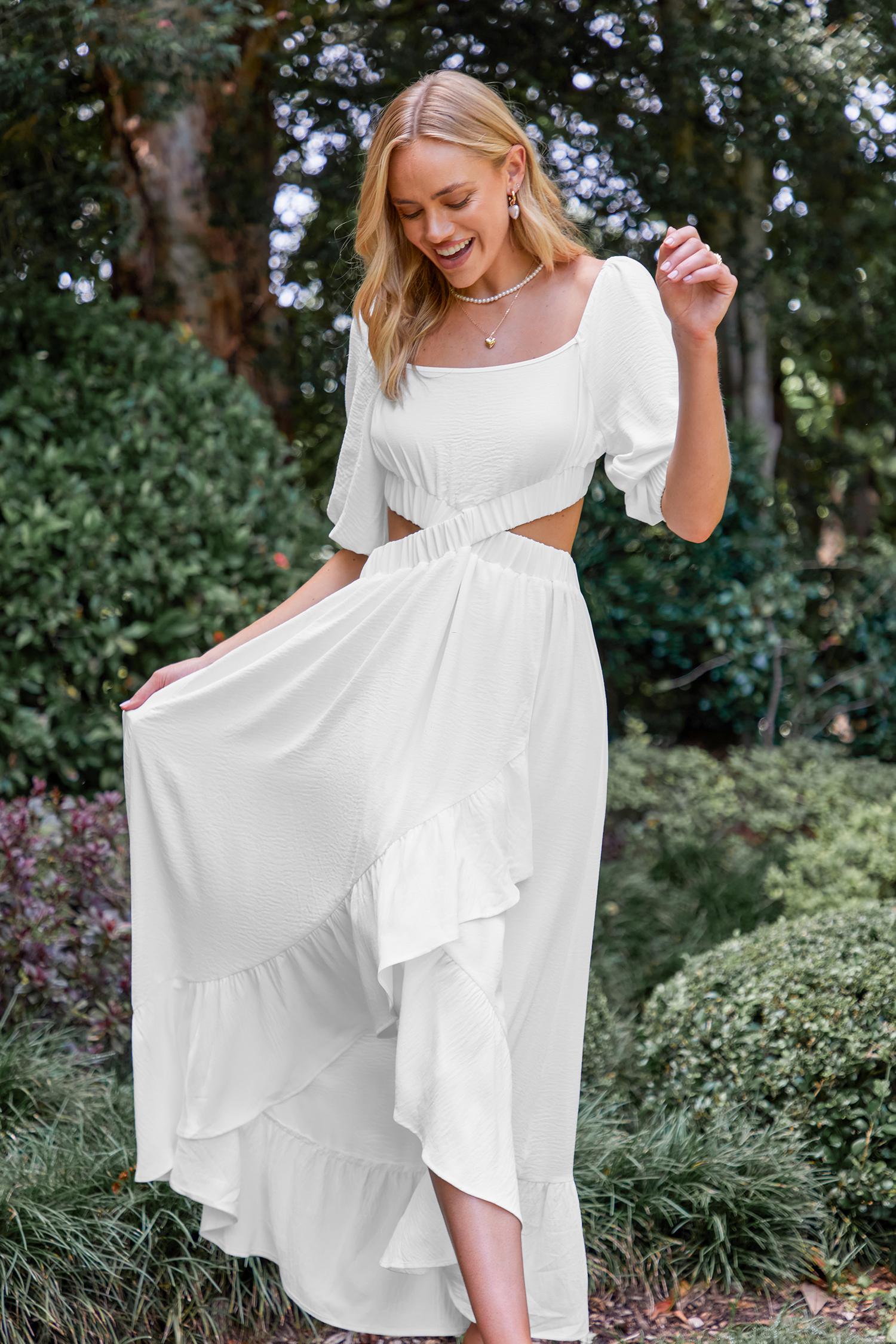 Vestido largo con volantes y recortes blanco