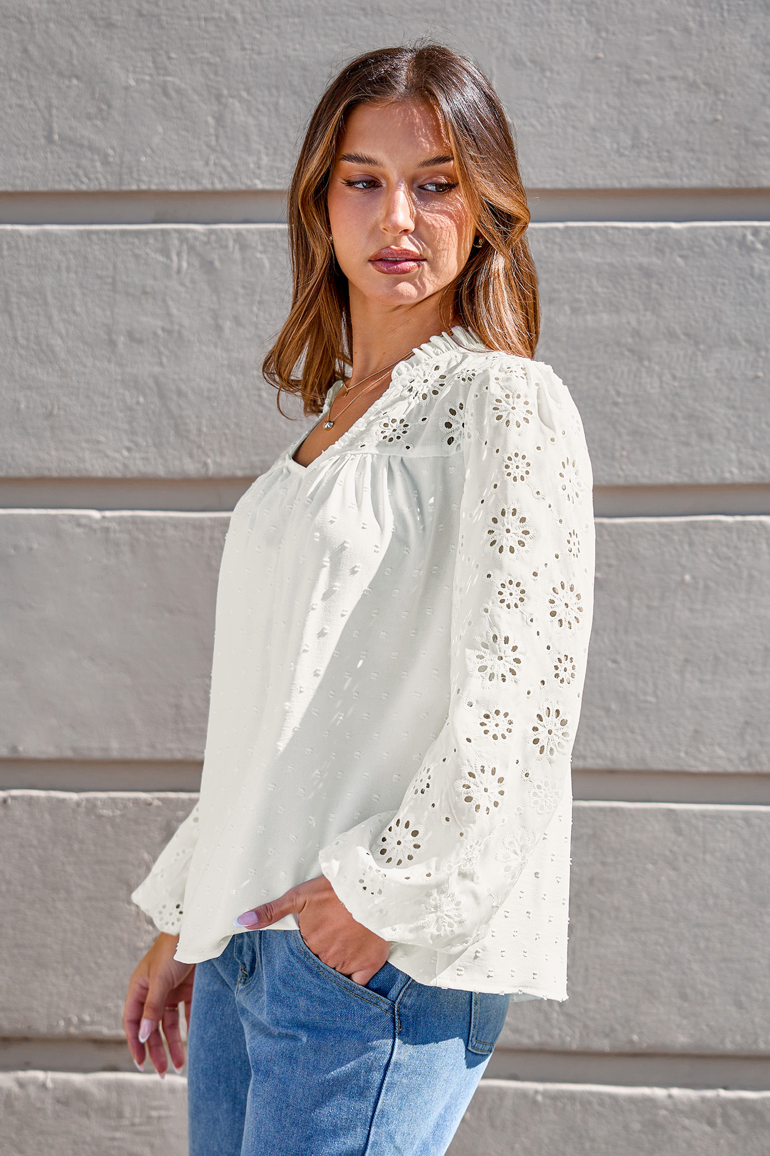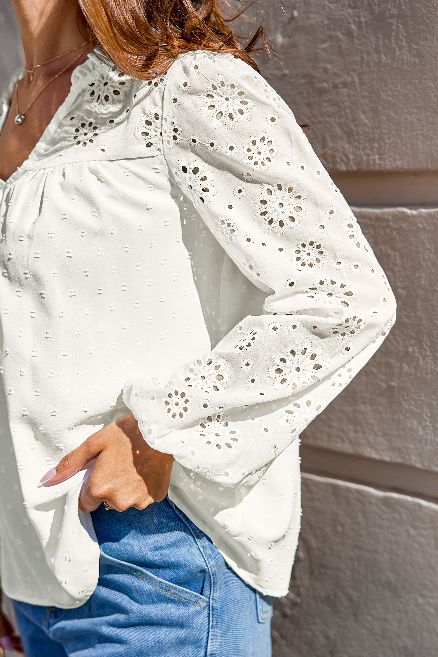 Blusa con cuello alto mangas abullonadas y ojales blancos