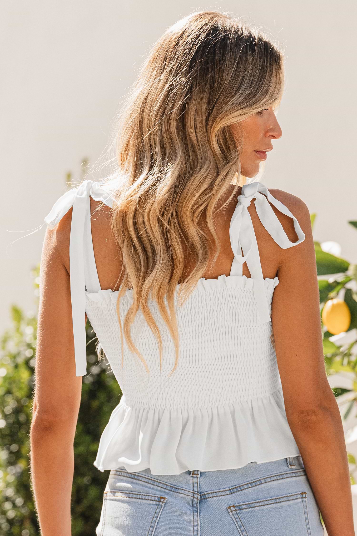 Top con volantes y corpiño fruncido blanco con lazo en los hombros