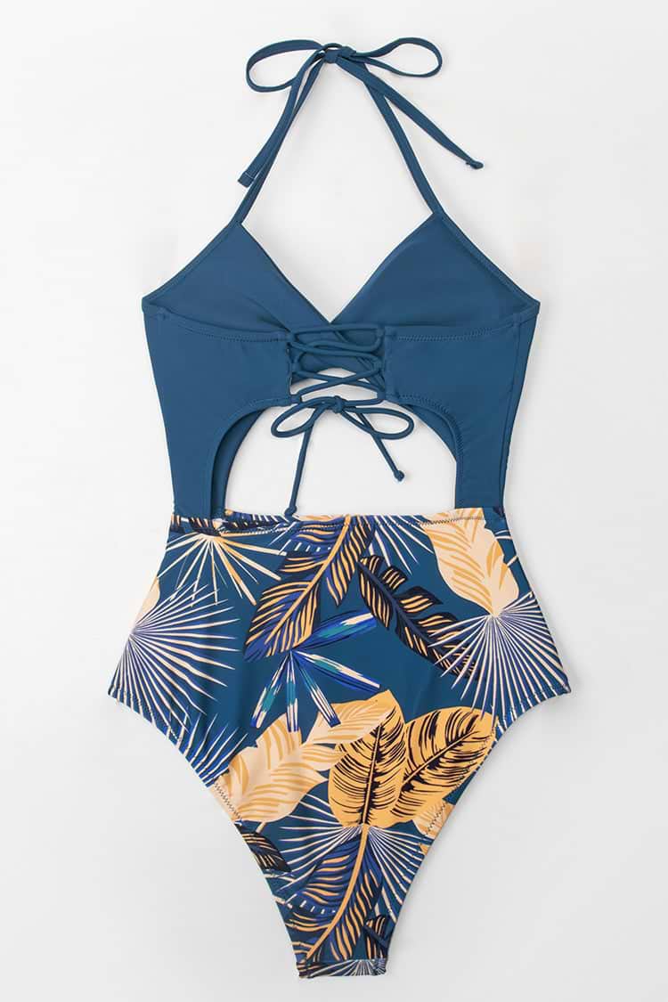Traje de baño de una pieza con espalda con cordones y aleteo floral